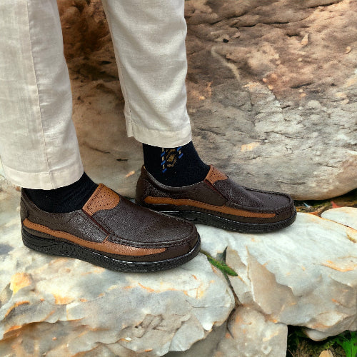 - STYLISH LOOK: New design and contrast stitching give these men leather shoes give a classic and elegant look. You can wear them at home, in the bedroom, while lounging in a resort, going out for a quick grocery shopping or just for a small walk around the city.